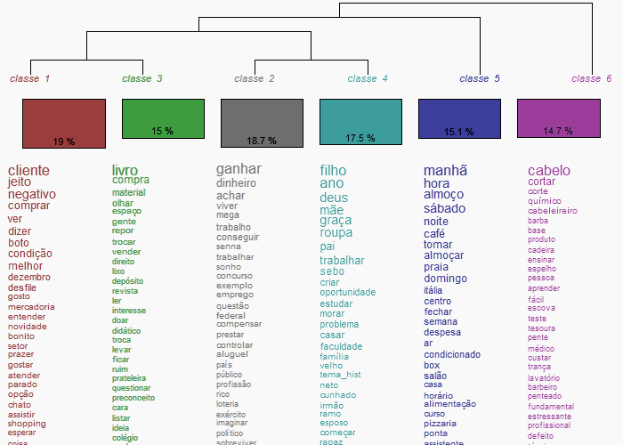 Para explanação sobre os conteúdos e contextos de cada classe, optou-se pela descrição por ordem de partição do corpus, ou seja, seguiu-se a ordem de composição de cada classe no dendrograma.
