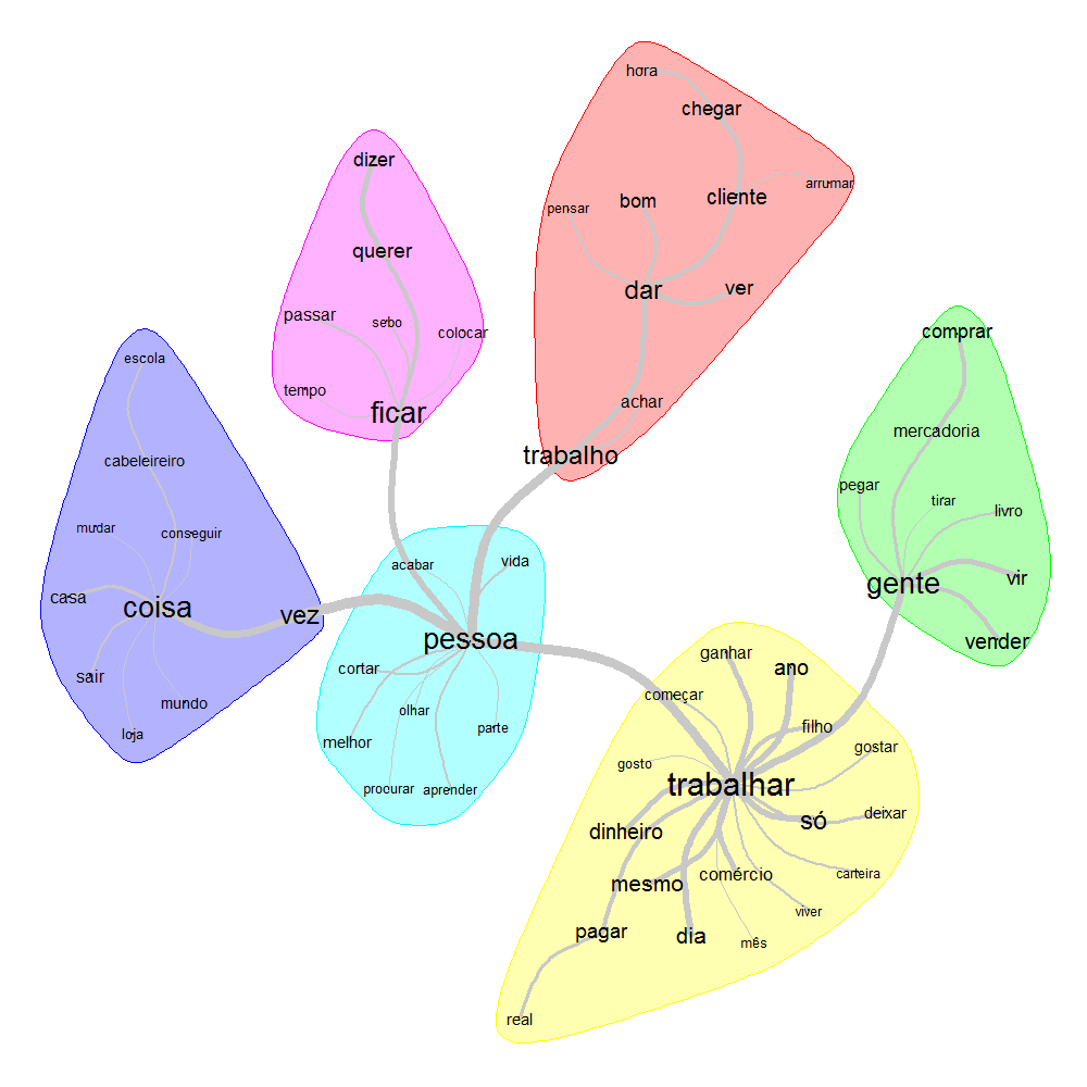 É possível observar na Figura 2 que se destacaram duas palavras organizadoras: pessoa e trabalhar, as quais apresentaram forte conexão entre si. Depreende-se pela organização da imagem, que no trabalho informal, as atividades estão centralizadas na figura do trabalhador, que é a pessoa que atua em todas as atividades laborais (compra, venda, controle de estoque, divulgação, etc.), algo que caracteriza o perfil do trabalhador por conta própria. Por outro lado, a ação de trabalhar apresenta o significado mais hegemônico da relação trabalho e dinheiro (pagar, ganhar e carteira), visto que a estrutura textual indica um grande enfoque no “fazer do trabalho”, ou seja, no seu objetivo: sobreviver.