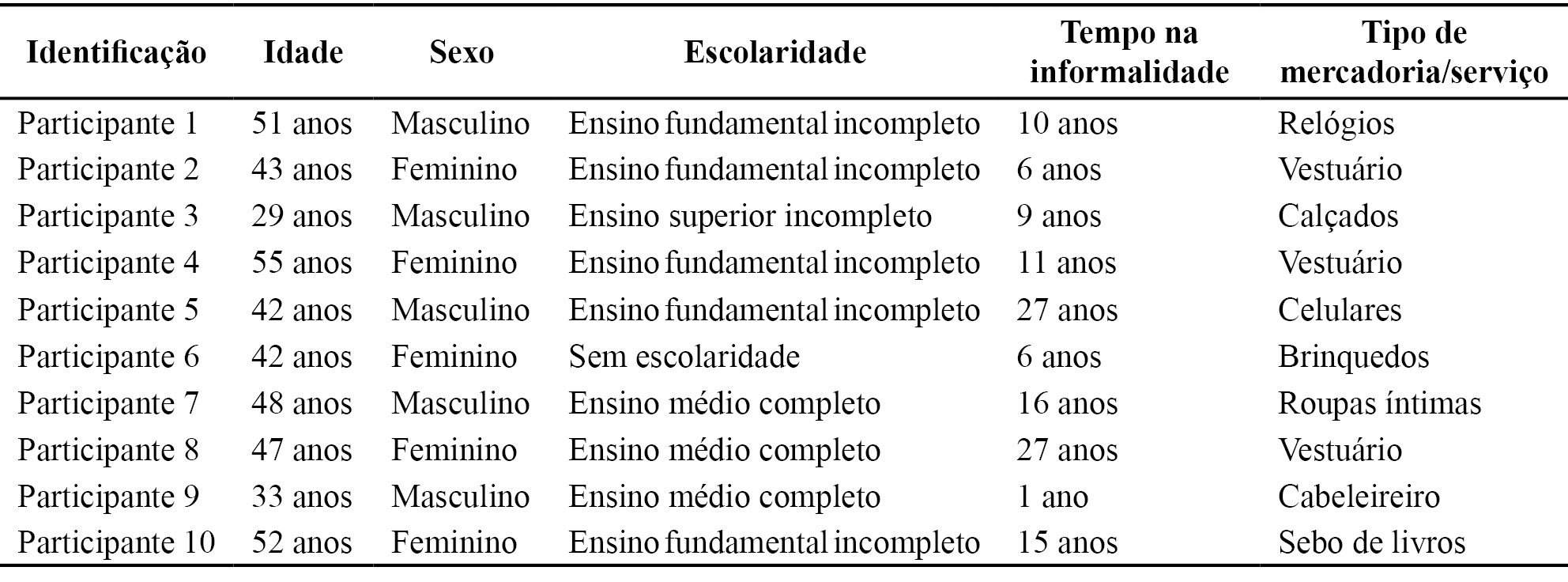 Dez trabalhadores do setor informal participaram do presente estudo. A composição da amostra foi definida a partir da saturação teórica (Fontanella et al., 2011), ou seja, quando não foi identificado o surgimento de novas categorias qualitativamente significativas quanto aos grupos temáticos de interesse, foi encerrada a composição do conjunto de participantes. Os entrevistados trabalhavam no momento da pesquisa em dois bairros do centro de uma cidade do nordeste brasileiro. Há nesses locais uma grande concentração de lojas com bancas de mercadorias nas calçadas das ruas ou em boxes em centros logísticos populares.