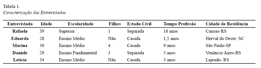 As entrevistas semiestruturadas tiveram duração aproximada de 40 minutos, foram gravadas com a permissão das entrevistadas e, posteriormente, transcritas. Três entrevistas presenciais ocorreram em locais sugeridos pelas entrevistadas (Rafaela, Daniela e Letícia). Em razão de residirem em diferentes estados, duas entrevistas (Eduarda e Marina) foram realizadas via Skype. Segundo Seitz (2015), a utilização de ferramentas tecnológicas, como o Skype, desafia o entrevistador por não possibilitar a percepção, por exemplo, de certos gestos não verbais, mas mesmo assim possuem benefícios que justificam sua validade. Para o presente estudo, a ferramenta ampliou as possibilidades de participação ao permitir acessar caminhoneiras com CNH categoria E que, de outra maneira, não poderiam ser entrevistadas.