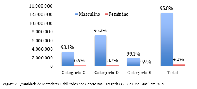 De acordo com dados obtidos junto a B. M. Gralha (comunicação pessoal, novembro de 2015), o número de mulheres habilitadas nas categorias citadas não chega a 5% do total que corresponde em números absolutos a 547.430 motoristas, sendo que, na categoria E ,exigente dos maiores pré-requisitos para habilitar-se, elas representam menos de 1% do total, ou o equivalente a 16.576 motoristas (Figura 2).