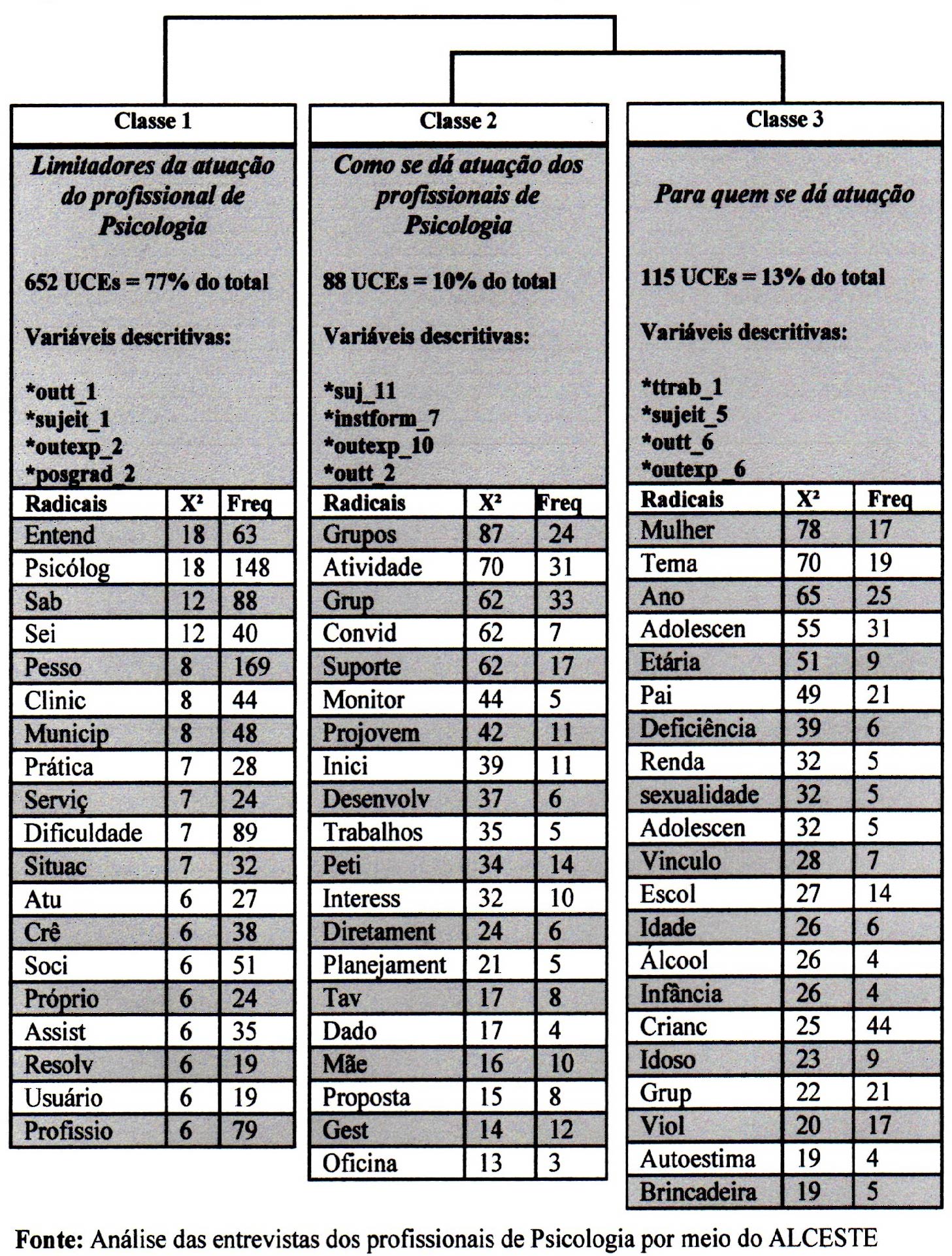 Na análise dos dados empíricos oriundos das entrevistas semiestruturadas dos onze profissionais de Psicologia, realizada por meio do software Alceste, foram encontradas 40.499 ocorrências de palavras, sendo que, dessas, 3.823 consistem em formas distintas, com uma divisão do corpus em 955 UCE. O corpus foi definido a partir de uma média (X = 11). Após a redução das palavras em suas raízes lexicais, das 3.823 palavras, 712 eram analisáveis e 228 eram palavras instrumentos. As 712 palavras analisáveis ocorreram 28 vezes para definir a UCE. As 955 UCE do corpus foram divididas em três classes principais, o que corresponde a 98,77% do aproveitamento total.