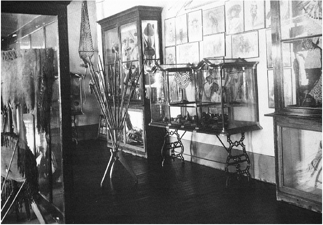 DEPARTAMENTO DE ETNOGRAFÍA ABORIGEN: Ocupa el segundo lugar entre los departamentos, pues el primero estudia al hombre físicamente, y este estudia las razas que habitan el país. Son siete salas, casi todas en el entresuelo. Están clasificadas por grupos raciales, colecciones de trastos, utensilios, prendas de indumentaria, pertrechos de guerra, pinturas y fotografías de tipos indígenas y mapas etnográficos. A este departamento está anexo el Instituto de Artes e Industrias Etnográficas que tiene por objeto fomentar las artes e industrias de las tribus primitivas. Se espera que se vuelva un establecimiento independiente, cuyo personal se encarga de coleccionar documentos etnográficos. [Castillo Ledón 1924].