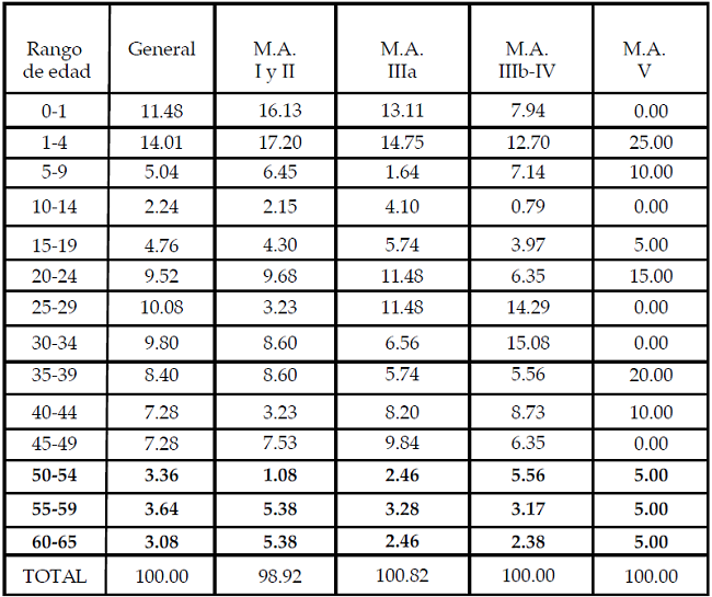 La distribución por edad de los esqueletos permite una primera distinción por grupos quinquenales. Cabe destacar la composición joven de la población [figura 5]. Los primeros cinco años de vida son los de mayor riesgo de muerte, alcanzando 25.4% del total de la población. En el grupo de 10 a 14 años tenemos los valores más bajos. Los porcentajes estimados para menores de 15 años tienen un comportamiento esperado en este tipo de sociedades antiguas (cuadro 1). A partir de los veinte años de edad identificamos un incremento en el número de individuos en el grupo de 25 a 29, después disminuye ligeramente y se mantiene hasta los 40-49 (7.28%). El porcentaje de individuos mayores de 45, alcanza 17.36% de la muestra general. Los mayores de 50 años se ubican en alrededor de 10%, que corresponde a la muestra específica de este estudio. La distribución porcentual por edad, de acuerdo con la clasificación por periodos cronológicos, se presenta en el cuadro 1.