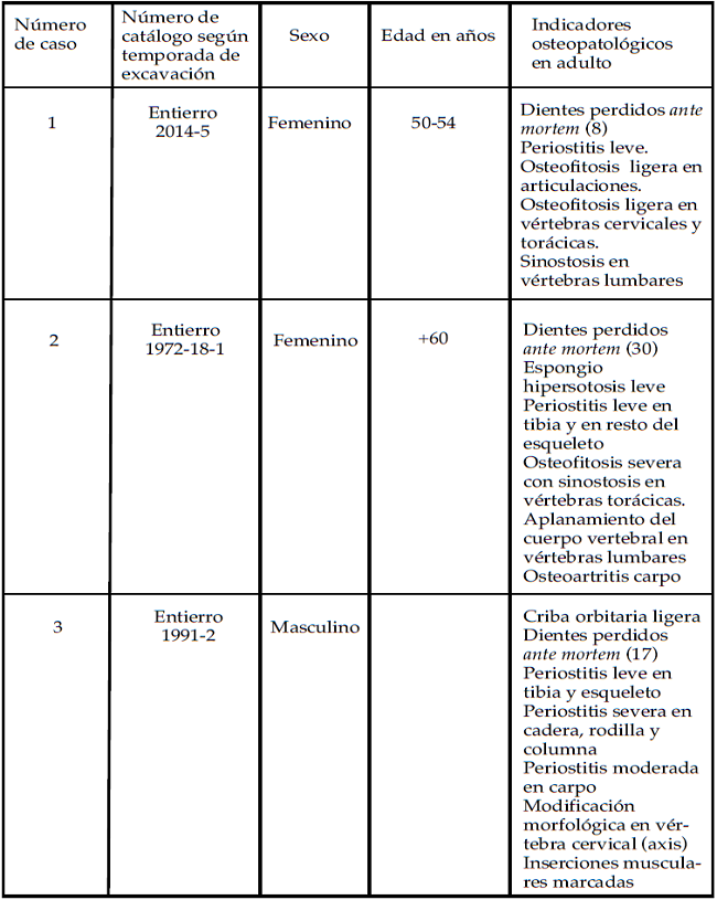 Con respecto a la pérdida de piezas dentales, su ocurrencia aumenta con la edad, siendo frecuentemente reportada como resultado de la masticación y la mala nutrición durante la vida [Waldron 2009]. Asimismo, algunas de estas enfermedades también pueden generar alteración en la apariencia física (como el desgaste o pérdida de los dientes) y en su funcionalidad (como las fracturas causadas por el adelgazamiento de los huesos, osteofitosis, osteoporosis y pérdida de la densidad ósea), generando dificultad para caminar o ejecutar las actividades habituales. Condiciones que pueden influir en la conformación y negociación de los papeles sociales de los adultos mayores [Appleby 2010].