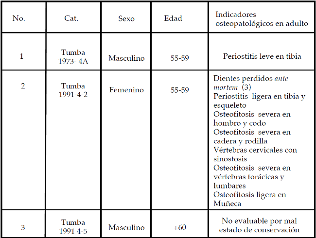 Considerando únicamente a aquellos individuos mayores de 50 años, hicimos un análisis con los indicadores de salud, que pueden revelar aspectos interesantes sobre la biografía de estos individuos. Algunos de los indicadores de disrupción biológica (estrés), como son las líneas de hipoplasia en el esmalte dental, se producen comúnmente por problemas nutricionales durante la infancia, ya que el diente se encuentra en proceso de crecimiento, y esto revela la situación biosocial del niño en la etapa de mayores requerimientos biológicos que es la del crecimiento [Goodman et al. Goodman et al. 1987; Goodman y Armelagos 1985; Goodman y Rose 1991; Goodman y Martin 2002]. De los 23 individuos únicamente dos mujeres presentaron líneas de hipoplasia dental, que revelan problemas nutricionales durante su periodo de crecimiento. Fueron enterradas bajo el piso de los cuartos de las unidades domésticas. Todos los demás esqueletos sólo registran enfermedades durante la edad adulta. Otros indicadores de estrés se relacionan, como ya mencionamos, con los procesos degenerativos en el transcurso de la vida y que se agudizan después de los 45 años: osteofitosis en las articulaciones, osteoporosis, pérdida ante mortem de dientes, pérdida de densidad ósea en las epífisis de huesos largos, procesos generales de descalcificación y pérdida de minerales. La información sobre la ubicación de los 23 esqueletos de adultos mayores de 50 años, identificados, ya fuera en tumba, o entierro (fosa o cista), y el sexo, revelan que los hombres, en su mayoría (61%) estaban enterrados en fosas y cistas y alrededor de 40% en tumbas. De igual forma las diferencias por sexo en las tumbas muestran el porcentaje más grande para hombres (67%) y en los entierros en fosas y cistas de 57%. En el cuadro general se encuentran asentados los datos del número de catálogo, el sexo, la edad y los indicadores de estrés (cuadros 2 y 3).