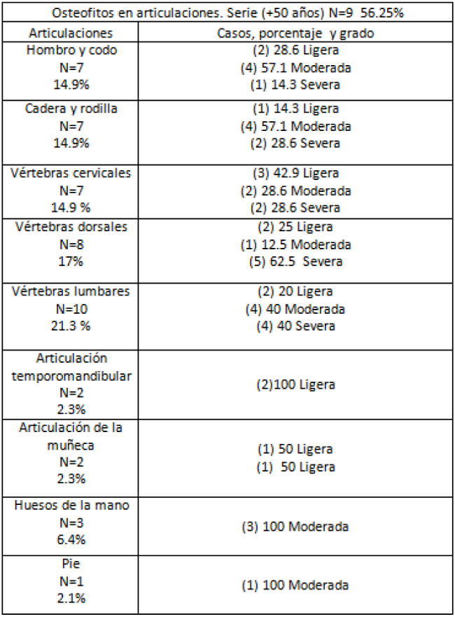 Por supuesto, uno de los problemas más comunes identificado en los adultos mayores son los osteoarticulares, con la degeneración del tejido óseo y que puede ser evaluado por medio de la tipificación de los procesos de crecimiento en forma de osteofitos, los rebordes en el hueso y en casos avanzados la sinostosis, o unión de dos segmentos en los huesos, ya sea de vértebras o de alguna otra de las grandes articulaciones, cadera, rodilla, hombro, codo, muñeca. De los 23 individuos analizados, 56% tuvieron este tipo de patología en varias partes del esqueleto, aunque en distintos niveles de severidad, que van desde ligera, moderada, severa o sinostosis. La región de la columna vertebral es la más afectada, en especial la región lumbar, como ya se ha reportado en otros estudios. El individuo 18 (1972) es una mujer mayor de 60 años que presenta fusión de las vértebras lumbares.