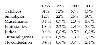Aunado a ello, y como bien señala Jacques Bouveresse [2007: 65], presenciamos, hoy en día, una situación de declive de las religiones instituidas en los llamados países desarrollados, contraria al incremento del sentimiento religioso y la búsqueda de nuevas espiritualidades que está en boga. Es evidente que este fenómeno sociológico masivo tiene consecuencias distintas cuando se trata de Francia6 o los Estados Unidos. Una de las consecuencias de esta situación consiste, al igual que el James de Las variedades de la experiencia religiosa [1999], en disociar religión y religiosidad [Taylor 2003]. Significa, que no tener o no pertenecer a una organización o movimiento religioso, no necesariamente implica no expresar una determinada religiosidad.