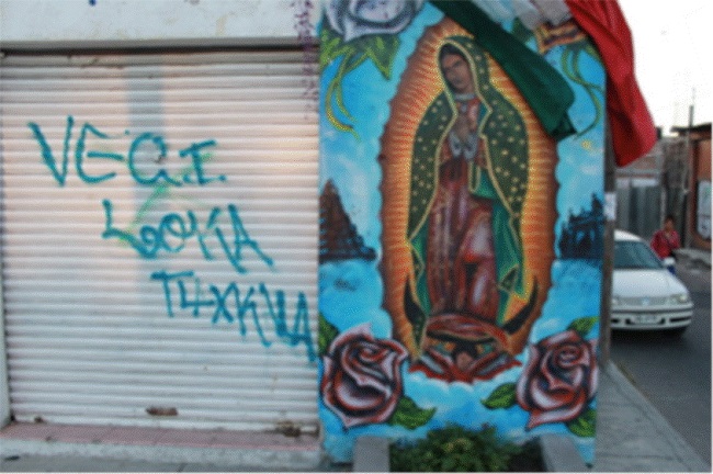 Frente a estos contextos de debilitamiento de la fe católica, en este artículo se busca reflexionar en torno al culto y la devoción a la Virgen de Guadalupe en tiempos actuales por parte de vecinos que residen en colonias populares de la ciudad de San Luis Potosí. Además, mi interés particular reside en analizar la manera en que la población joven, especialmente aquellos que forman parte de grupos organizados como son las pandillas, logran un acercamiento y viven su religiosidad en torno a las imágenes de la Virgen de Guadalupe; en especial aquellas imágenes que ellos mismos pintan en las bardas-muros de “sus territorios”. Desde su punto de vista, la virgen es identificada por ellos como una imagen que les brinda protección, pero también les sirve como un marcador de su territorio, un territorio al que hay que defender de las intromisiones de las pandillas rivales. En estos espacios de conflicto y de violencia la virgen es una presencia constante y frecuente.