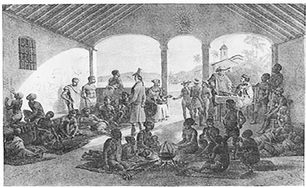 Esta obra muestra de manera general un momento de la vida colonial de los esclavizados en el Brasil colonial: el momento transicional después del viaje a la venta. Se podrían definir más analíticamente tres fenómenos sociales e históricos. El primero es la ocupación del espacio por parte de los sujetos en un mercado de esclavos. Ocupación del espacio que se hace mediante las actividades de los esclavizados. Seguimos aquí a Alejandra Mailhe [2007] cuando los caracteriza como los “lugares de sociabilidades” en esta escena. Por ejemplo, se observa al centro de la imagen, que varios de ellos están agrupados para comer. Algunos, se encuentran mirando hacia otro lugar. Otro grupo está interactuando al lado de la pared. La postura física descrita caracteriza también la ocupación del espacio, vemos a esclavos acostados como rendidos y otros con rasgos de concentración.