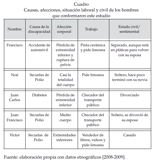 Los datos etnográficos del presente texto provienen de la investigación cualitativa realizada durante el periodo de 2008-2009, con hombres en situación de discapacidad, residentes en la Ciudad de México. Algunos de ellos la adquirieron en edad adulta y otros más a temprana edad (véase cuadro). Son personas que hacen vida, trabajan y piden limosna en la calle. Como criterio de inclusión en el estudio, se tomó como base el muestreo por conveniencia. Este tipo de muestreo tiene su origen en consideraciones pragmáticas, con el que se busca obtener mejor información en el menor tiempo posible, de acuerdo con las circunstancias concretas que rodean tanto al investigador como a los sujetos [Quintana 2006: 59]. En este sentido, la inclusión de los participantes en el estudio fue relativamente arbitraria y fortuita, ya que, desde el primer acercamiento con ellos, las interacciones entre investigador y participante fluyeron de forma rápida y favorable. Como criterio de selección se consideró, por un lado, el trabajo con adultos y no con niños o adolescentes, dado el requisito de la supervisión de un adulto y la complejidad de los temas de interés como la sexualidad o la muerte, entre otros; por otro lado, tampoco se planteó el trabajar con mujeres, debido a los tiempos y marcos limitados del periodo de investigación, por lo que se valoró su inclusión para un estudio posterior. En cuanto a la zona de realización del trabajo de campo, se seleccionó el sur de la Ciudad de México, por sus características urbanas y propicias para la realización de trabajo de campo prolongado.