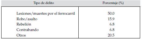 En cuanto a los crímenes cometidos por los mismos yaquis, fue el robo el más común, teniendo en cuenta también su modalidad de asalto. Se percibe una diferencia sustancial respecto de las siguientes transgresiones. En este cuadro (3), es pertinente aclarar, que se presentan los delitos en los que los yaquis estuvieron involucrados, ya sea como victimarios o como víctimas (esto último en el caso de accidentes relacionados con el ferrocarril).