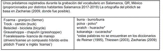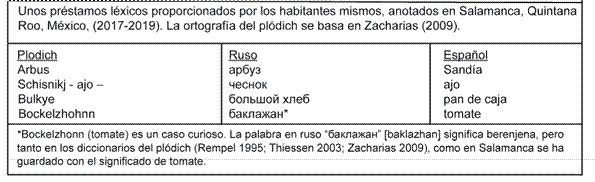 Unos pocos préstamos léxicos proporcionados por los habitantes mismos, anotados en Salamanca, Quintana Roo, México, (2017-2019). La ortografía del plódich se basa en Zacharias [2009].