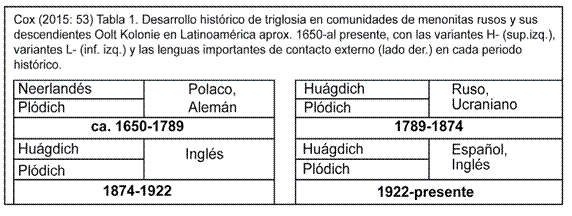 Así que con base en el uso de las distintas lenguas en y alrededor de las comunidades de menonitas ortodoxos (Oolt Kolonie y tal vez otros asentamientos conservadores) podríamos hablar de una situación de diglosia (de acuerdo con la definición de Ferguson [1959] y la apreciación de Wölck [2008], de triglosia [Cox 2013] o sencillamente de una situación de isla lingüística (término originario de la lingüística alemana)8 que en este caso al interior maneja dos variantes germánicas, y al exterior tienen un acceso limitado y meramente útil a la lengua dominante del entorno.