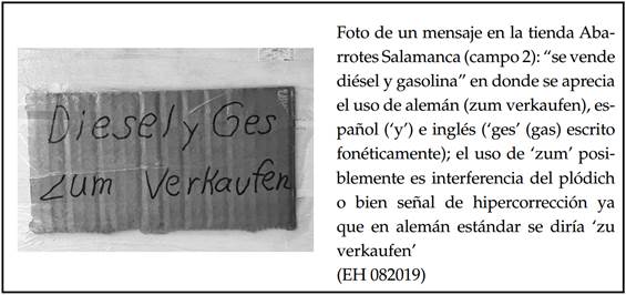 Esta reserva sobre sus conocimientos del alemán hemos observado en varias personas en Salamanca, mientras que también hay algunas personas que conversan sin problema notable en un alemán parecido al alemán estándar. En la colonia vecina de El Bajío (QR) pudimos tener una conversación bastante fluida en alemán con un maestro y productor agrícola originario de Chihuahua. En Indian Creek (Belice), el maestro arriba mencionado tenía escrito en sus pizarrones una lista (clásica para quienes han aprendido el alemán estándar) con las preposiciones y sus casos, algo no visto en escuelas en Salamanca. Como ya se mencionó, en Blue Creek (Belice), el alto alemán tan sólo se enseña en un reducido contexto del aprendizaje de cantos, pero en las casas el plódich aún es la lengua más hablada, seguida inmediatamente por el inglés (entrevista, julio, 2019).
