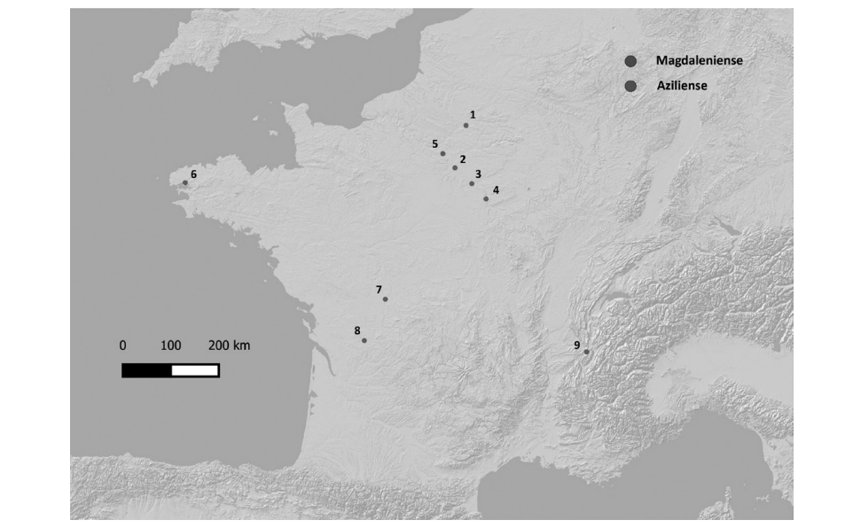 Fuente: INRAP [2019] (modificado).Es decir, que al menos en este ejemplo del suroeste de Francia las convenciones de figuración naturalista de animales propias del magdaleniense habrían persistido hasta la parte más reciente del Tardiglaciar en las tradiciones artísticas del aziliense.