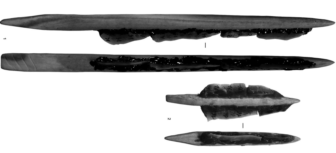 1. Punta de asta de reno con doble bisel (subtipo grande) con una sola fila de soportes micro-laminares de pedernal.