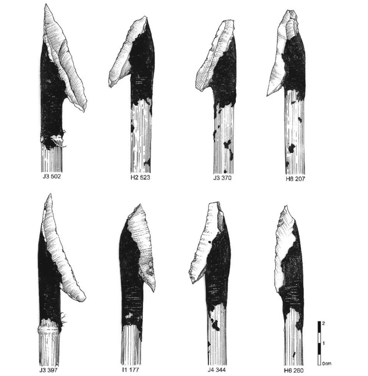 Fuente: Petillon et al. [2011: fig. 7]Bi-puntas con estrías de impacto tangenciales al eje principal: BR4 H2 523, H8 207, I1 177, J3 370, J3 502, J4 344. Mono-punta de base redonda con estrías de impacto paralelas al eje: BR4 H6 260