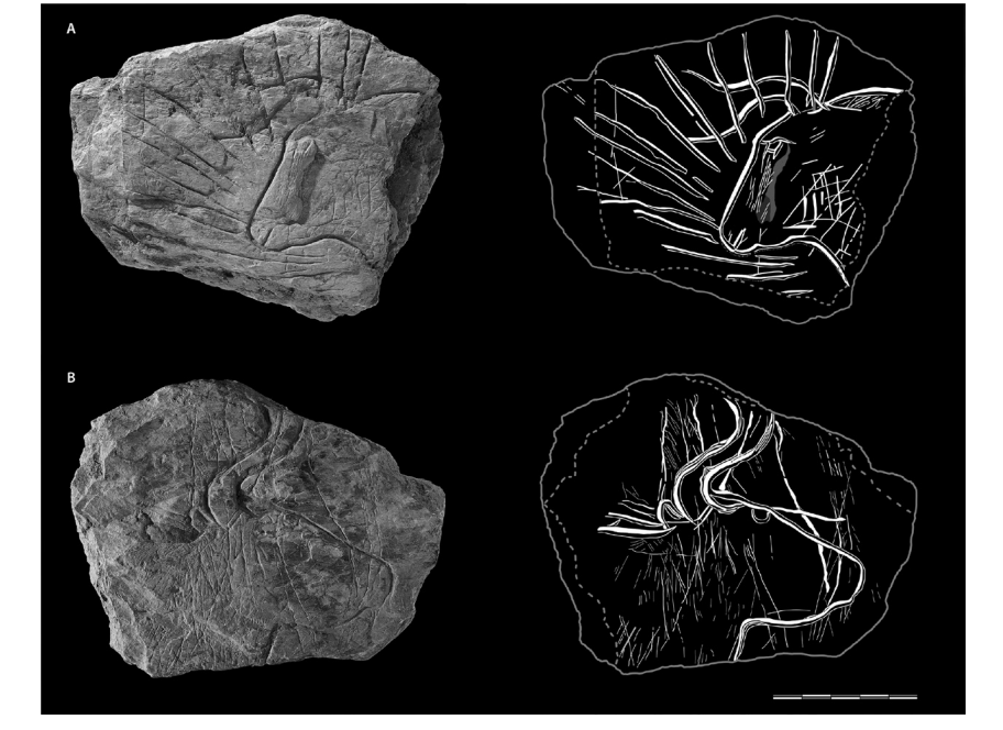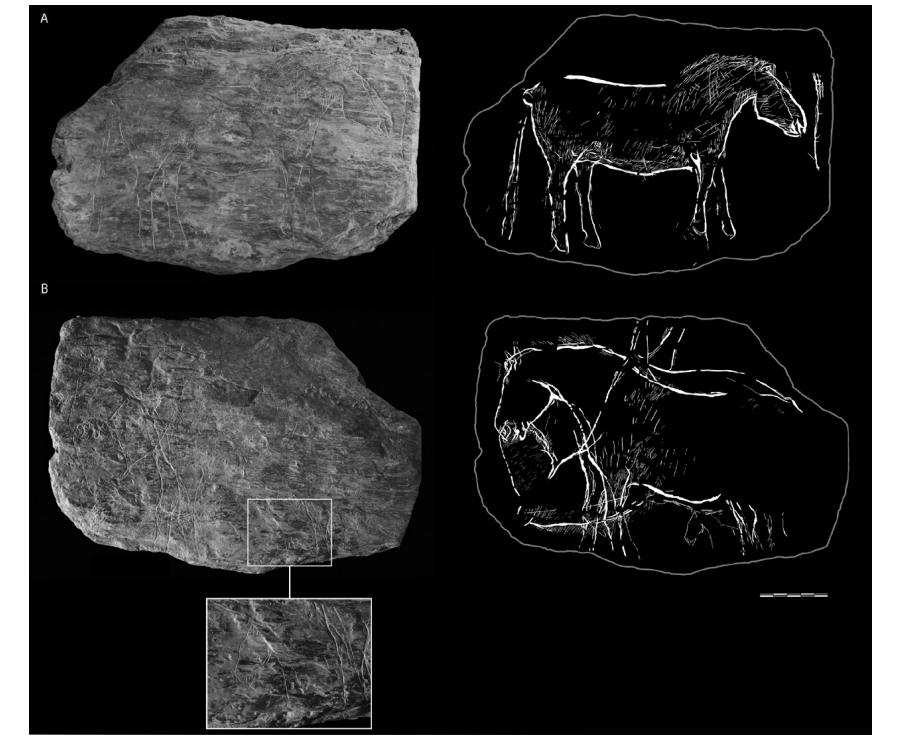 Fuente: Naudinot et al. [2017: fig.7].La idea tradicional de la desaparición abrupta del arte animal figurativo magdaleniense y su remplazo por el arte decorativo abstracto aziliense ha querido ser salvada con el argumento de que, dado que se tratan de niveles del aziliense temprano, podríamos interpretar este corpus como las últimas supervivencias magdalenienses al comienzo del Tardiglaciar. Sin embargo, parece ser que la incómoda realidad vino bruscamente a perturbar los cimientos de este saber recibido cuando —en el verano del 2019— el equipo de arqueólogos del INRAP (Institut National de Recherches Archéologiques Préventives) dirigido por Miguel Biard anunció el descubrimiento de un impresionante bloque gravado perteneciente a una superficie de ocupación aziliense en las excavaciones preventivas en el barrio de la estación férrea de Angoulême en Charente, suroeste de Francia [Charpentier 2019] (imagen 1). Se trata de un “sitio de cacería” perteneciente al azilense reciente y por tanto situado cronológicamente alrededor del 12 000 A.P; es decir al final del Allerød (GI-1a) y al inicio del Dryas III o reciente (gs-1); o, en otras palabras, alrededor de dos milenios más reciente que las plaquetas bretonas del Rocher de l’Impératrice. El descubrimiento es un bloque de arenisca (grès siliceux) (imagen 7) de 25x18 cm decorado en una cara con una superposición en espiral de una figuración naturalista de un caballo, junto con otras tres figuras posiblemente de otro caballo, un cérvido y un uro. En la cara posterior está representada la parte trasera de un caballo y ambas caras exhiben los motivos geométricos lineales característicos del aziliense reciente.