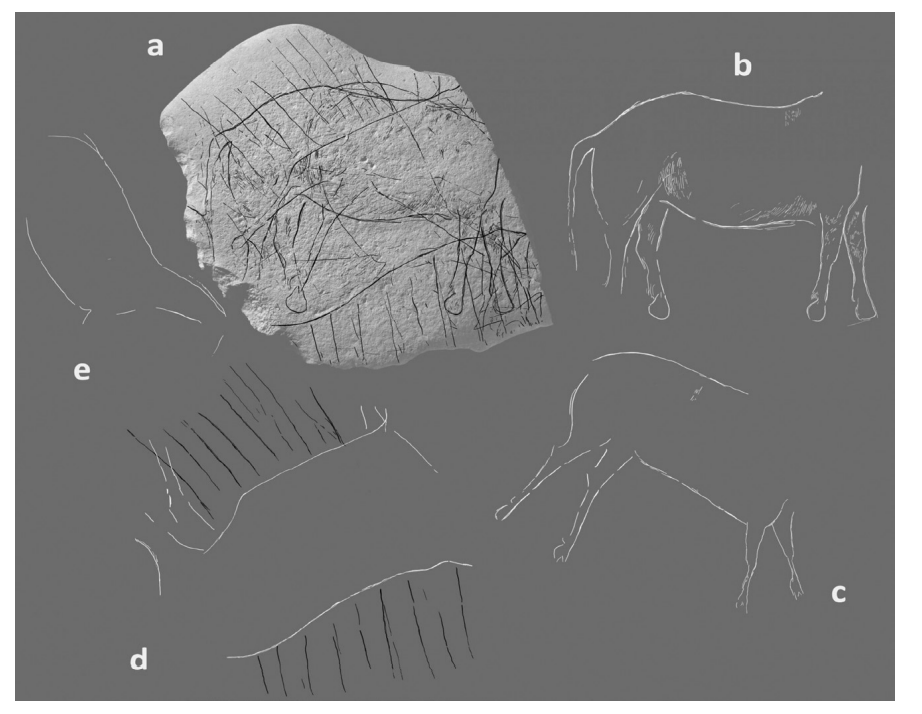 Fuente: Naudinot et al. [2017: fig.7].a) Cara principal con la superposición de 4 figuraciones animales flanqueadas por series de líneas paralelas. Análisis de la composición: b) representación naturalista de caballo, falta la cabeza en la parte fracturada del bloque; c) posible representación de cérvido, cabeza faltante; d) posible representación de uro, cabeza faltante y e) representación esquemática de posible caballo.