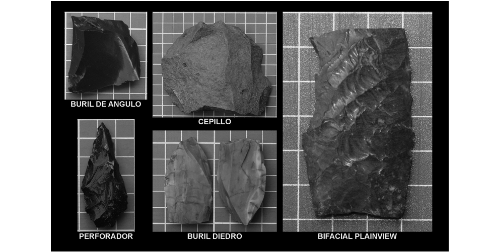 El uso casi exclusivo de la obsidiana es un rasgo que se manifiesta sobre todo en el Altiplano y en zonas como ésta, cercanas a varios yacimientos. Implica cambios en la morfología de algunas herramientas y en las estrategias de manufactura. En la foto 2 se ilustra un detalle del depósito con una gran cantidad de lascas, la mayoría de dimensiones pequeñas. No hay restos de percutores, que puede deberse a lo reducido de la muestra excavada. Las herramientas recuperadas (foto 3), 1 perforador, 1 cepillo y varios buriles, pueden ser un equipo de trabajo para fabricar ástiles de madera.