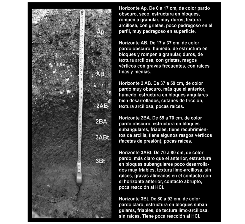 El pt es una secuencia de tres suelos: Ap/AB/2AB/2BA/3ABt/3Bt. El superficial es de color pardo muy oscuro, arcilloso, bien estructurado, con cutanes de estrés. El segundo es un paleosuelo con características semejantes, pero de mayor pedogénesis observada por más contenido de arcillas y mejor estructuración. Sus características vérticas, como los cutanes de estrés, son muy claras y el contacto con el suelo superior es abrupto. El paleosuelo más profundo contrasta notoriamente con los dos superiores: los horizontes son de color pardo claro, limo-arcillosos y sus estructuras son en bloques angulares de 3 cm en promedio.