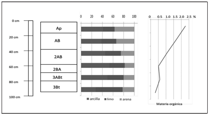 En cuanto a la materia orgánica, el suelo superficial es el que tiene el mayor porcentaje, que disminuye en los paleosuelos más antiguos, según lo esperado. Es de notar que en el horizonte 3ABt se aprecia un ligero aumento, 0.6%, lo que señala que ese nivel fue superficie y por lo tanto separa a este ciclo de formación de suelo del que se desarrolló arriba de este.
