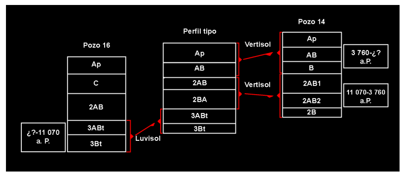 En el pozo 16 se obtuvieron dos dataciones, ambas fueron de carbones encontrados en la superficie del paleosuelo 3, muy similares entre sí, de 7 795 a 7 620 años AP (5 846 a 5 671 a. C.; Beta 487573) y 7 720 a 7 590 años AP (5 770 a 5 640 a. C; Beta 367974). La coincidencia de ambas fechas sobre la superficie del paleosuelo 3 de dicho pozo plantea la posibilidad que sea una edad cercana al final del desarrollo del paleosuelo. En este momento, probablemente, se dio un proceso erosivo que expuso partes del contexto y marcó localmente la interrupción del proceso edáfico, pero sin la evidencia de la formación del vertisol, que se observa en la secuencia de la porción norte del sitio. Como se detectó en el análisis micromorfológico, hay indicadores pedogenéticos de un periodo de desarrollo del paleosuelo de miles de años, de tal forma que se confirma la posibilidad que su desarrollo comenzara al final del Pleistoceno.