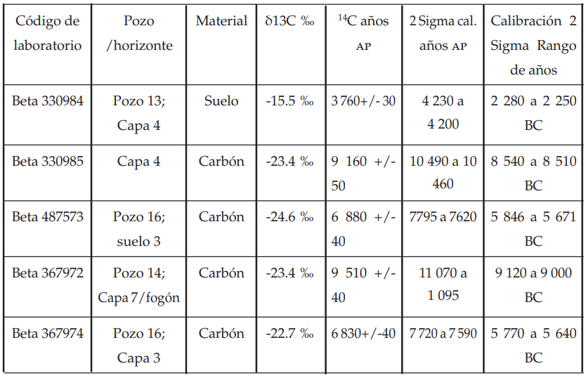 Se utilizaron seis fechas, sobre muestras de suelo y carbón obtenidas en el pozo 13 de la temporada 2012 y en los pozos 13 y 14 de la temporada 2013. El pozo 13 tiene dos dataciones, la primera corresponde a la materia orgánica del horizonte 2AB, su datación fue 4 230 a 4 200 años AP (2 280 a 2 250 a. C.; Beta 330984), (tabla 1). Esta edad indica el momento en el cual el suelo fue sepultado e implica que el paleosuelo tuvo varios miles de años de evolución, permaneciendo como superficie todo el tiempo hasta que fue sepultado por un sedimento, terminando su desarrollo. Sobre la misma superficie se obtuvo una datación de un fragmento de carbón, obteniendo una edad de 10 490 a 10 460 años AP (8 540 a 8 510 a. C.; Beta 330985), congruente con la temporalidad reconocida para Plainview.