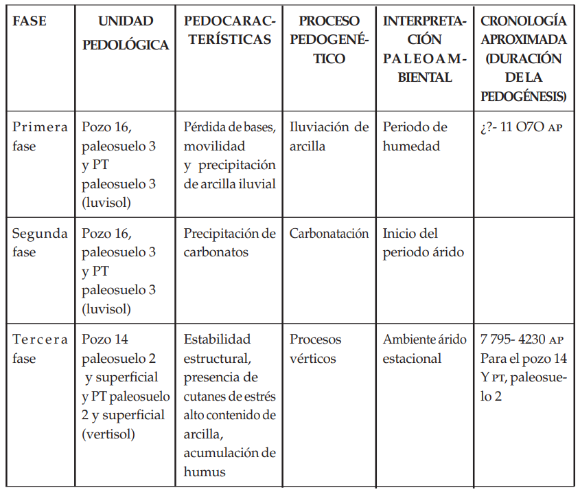 1) Fase inicial. Iluviación y procesos estágnicos, indicada por la arcilla iluvial de los horizontes 3ABt y 3Bt y la presencia de nódulos de compuestos ferruginosos. El proceso de iluviación implica una lixiviación de bases como condición para que el proceso pueda llevarse a cabo y los procesos estágnicos involucran periodos alternos de saturación y drenaje de agua frecuentes a lo largo del año. Estas características pedogenéticas corresponden a un primer periodo de humedad.