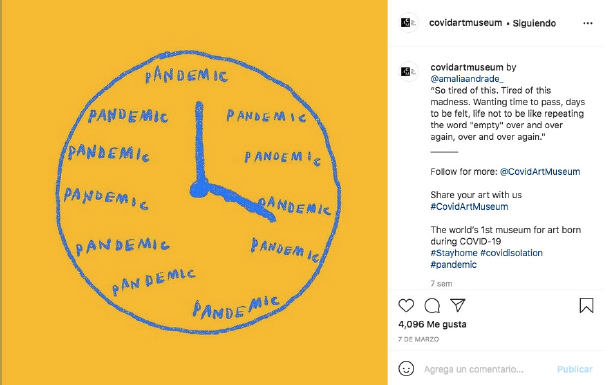 Ahora bien, las expresiones museísticas de la pandemia son heterogéneas y producen sentimientos encontrados. El Covid Art Museum (@covidartmuseum / Museo de Arte Covid-cam) 19 surgió como una iniciativa museográfica digital durante el mes de marzo de 2020. En un paralelismo con el “museo imaginario” de André Malraux, este museo ha franqueado barreras geográficas y disciplinarias, agrupando más de 800 obras de artistas provenientes de alrededor de 100 países. Alojado en la red social Instagram, el cam cuenta con más de 160 mil seguidores que disfrutan de las obras y sus contenidos sobre la pandemia. Es probable que la idea original no tuviera este objetivo, pero el cam es hoy un espacio de activismo digital que valida experiencias individuales en torno a problemas sociales de amplio espectro y posibilita críticas al sistema del norte global.