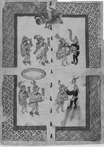 Volviendo ahora a nuestras imágenes, en el Códice Borbónico, como vimos, la fiesta de Ochpaniztli, pp. 29-30, dedicada a Chicomecoatl/Xilonen, se representa de una manera dilatada, incluyendo a Teotleco, p. 31 [Fig. 1]. En la página 29 [Fig. 5], sacerdotes con atavíos de dioses danzan frente al sacerdote/diosa cargando varios atributos e instrumentos cuales caracol, sonaja y trompeta. Según lo reportado por Sahagún [1979: libro II, cap. 30], Chicomecoatl en la parte izquierda es el sacerdote que llevará al cabo el ritual de sacrificio y desollamiento de una mujer que se hacía a medianoche dentro del templo, en un momento y en un lugar no accesible (i.e., en un lugar y en un momento en el cual se llevan a cabo las “veladas”).