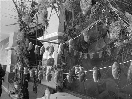 Este extracto de un canto de Baldomero Pineda, anciano caracterizado de Santa Cruz Juárez, una pequeña agencia de Huautla de Jiménez, abre una pista para seguir la larga secuencia de ritos en los códices Borbónico y Borgia. El canto, que Baldomero no entonó durante una ceremonia, sino que es un recuerdo de sus abuelitos, evidencia que el rito en sí es una búsqueda. La persona que canta está perdida en la oscuridad, el conocimiento está ocultado. La referencia al “presidente”, término dado en español en el original mazateco, parece indicar la búsqueda de una persona de autoridad, un líder que sepa guiar a su gente. El canto es relatado por el oro que, explicó Baldomero, es el cacao, la forma de pago a través de la cual se ruega a los dioses. El uso de la tercera persona para relatar el discurso directo es un hecho común en los cantos mazatecos [Munn 1973, Frassani 2016: 454-455] que resalta la impersonalidad del canto y permite al cantor intercambiar roles con facilidad. Hay muy a menudo una confusión o falta de claridad acerca de quién está hablando y a quién se dirigen las palabras del canto, otro elemento característico de estos tipos de textos y performances, en los que varias voces, puntos de vista e identidades se sobreponen e intercambian recíprocamente [Severi 2008]. El oro dice que la persona en búsqueda de un presidente pide y ruega con mucha humildad, pero también sabe brincar y saltar, o sea resolver los problemas con rapidez. En esta sección el canto acaba con una referencia al cielo, donde está el conocimiento, y un punto donde aparece vislumbrarse una puerta, una entrada hacia el cielo. Antes de entonar esta parte del canto Baldomero nos explicó que la puerta del cielo se abrió en el año 1 -a comienzo de todos los tiempos- y es de ahí de donde salen los difuntos durante las celebraciones de Día de Muertos. Baldomento describió la puerta como un arco ritual de los que se arman en los altares durante las mismas celebraciones de noviembre y del cual cuelgan ofrendas de hombres hechas de pan y tortilla [Fig 12].