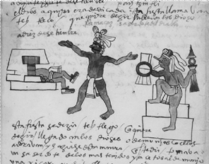 El cuerpo de la persona recostada dentro del templo en el Códice Ixtlilxochitl [Fig. 4] muestra unas manchas negras en su cuerpo que se han interpretado como quemaduras, basándose en los textos acerca de la hoguera citados arriba [Doesburg 1996: 68-69]. Aquí propongo que a esta interpretación se puede agregar otra, sin que las dos sean mutuamente excluyentes: manchas de jaguar, tal como explica María Sabina en su canto y refiere Durán en su crónica. El tizne crea manchas negras en el huipil/piel, señales de que está ocurriendo una transformación. Dos fuentes muy diferentes, pero cronológicamente cercanas, valoran esta interpretación. En los Memoriales con Escolios recopilados por Sahagún [Anderson y Dibble 1953: 50], se relata un acontecimiento específico de la creación del último Sol que sucedió en Teotihuacán. Varios dioses se reunieron alrededor de un fogón y pidieron a Nanahuatzin y Tecuciztecatl que se arrojaran al fuego. Los dos dioses dudaron en principio, pero luego obedecieron. A seguir, el águila y el jaguar también se arrojaron y salieron con las características manchas que vemos en sus plumas y pelaje hoy en día. Por otro lado, alrededor de 1540s, en el pueblo mixteco de Yanhuitlán, Francisco de la Casas, gobernador y sacerdote indígena local, fue acusado y perseguido por obedecer a la religión de sus ancestros bajo el regimen colonial. Según lo relatado por testigos oculares durante un proceso inquisitorial que fue librado en su contra, el sacerdote solía mandar hacer tinta negra con carbón. Luego untaba su cuerpo con ella y se volvía tigre [Sepúlveda y Herrera 1999: 210]. Estas dos fuentes crean un puente entre las imágenes y relatos acerca de la religión antigua y la experiencia moderna de los mazatecos, en específico con el paso en el canto de María Sabina que se citó arriba.