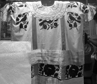 Este pequeño extracto forma parte de un canto más largo, cuya grabación se invita atentamente el lector a escuchar [https://youtu.be/KQwV3JixyI], que la sacerdotisa entona con la intención de invocar a sí misma, enumerando sus poderes. Para nuestro caso, resultan especialmente sugerentes las primeras líneas, en las que María Sabina dice explícitamente que ella es la mujer que sabe volverse tigre (jaguar). La capacidad de volverse en uno de los nahuales más poderosos no reside tanto en el hecho de ser tigre, sino más bien en el poder de volverse tigre. Se hace énfasis en el proceso de transformación y en la capacidad, totalmente subjetiva, de ver las cosas de manera diferente: detectar señales ahí donde los demás solo ven manchas, líneas o colores. Con base en esta información, interpretamos los dos últimos versos como una referencia a las plantillas de papel que las mujeres ocupan para bordar los huipiles. La imagen que se quiere plasmar con el hilo se dibuja anteriormente sobre el huipil blanco con un polvo de tizne [Fig. 3]. Así que María Sabina entiende que ella sabe transformarse en jaguar porque puede reconocer las huellas (señales) dejada por el tizne en el huipil no sencillamente como la guía para bordar imágenes, sino como manchas del jaguar. Ella reinterpreta y reinscribe una actividad femenina cotidiana a la luz de su propia sabiduría como chjon chijné (mujer de conocimiento).