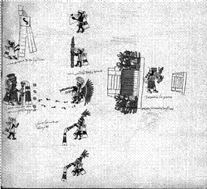 El valor primario que se otorga al acto interpretativo, diferentemente de una supuesta manifestación inequívoca de lo divino, puede también llevar a fatales errores. Analicemos, por ejemplo, la representación de la misma ceremonia de Teotleco en el Códice Ixtlilxochitl [Fig. 4]. La profusión de sangre que sale de los templos alerta acerca de la distorsión terrífica operada por el tlacuilo [Batalla Rosado 2002: 208-210]. Las volutas de humo que salen del templo dentro el cual se encuentra recostado el cuerpo del sacrificado parecen una referencia al hecho de tirar al fuego esclavos durante esta ceremonia [Códice Tudela, f. 22r]. El texto del Códice Florentino [Sahagún 1979: libro II, cap. 31], por su parte, explica que cuando las víctimas se echaban al fuego, algunos sacerdotes bailaban y se movían como ardillas, traían crestas de animal, chiflaban como el fuego al acercarse a éste. Otro se vestía como murciélago. Todas estas descripciones indican transformaciones en nahuales que se llevaban a cabo al interior del templo y no a la vista del público.