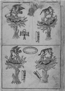 Otro ejemplo que muestra indudables parecidos iconográficos y de contenido con escenas del Códice Borgia lo ofrece la Historia Tolteca-Chichimeca, ff. 20r y 21r [Figs. 9 y 10], un documento colonial temprano procedente de la región de Cuauhtinchan, Puebla, que narra el origen, migración e peripecias del linaje nahua local. En la primera escena hay cuatro representaciones similares: unos cazadores dejaron los instrumentos de su trabajo al lado de unos árboles y se recostaron encima de éstos. Dos águilas y dos jaguares -símbolos de realeza- los están nutriendo, como se entiende del líquido que sale de sus bocas. El ritual se hizo para que los cuatro líderes alcanzaran el estatus real, como parte de una serie más larga de ceremonias, entre las que destaca la perforación de la nariz con subsecuente inserto de piedra preciosa en la lámina siguiente [Fig. 10] [Kirchhoff, Odena Güemes y Reyes García 1989: 171-172, Olivier 2015: 466-473]. Se trata entonces de ritos de paso a través de los cuales los líderes de Cuauhtinchan demuestran su valor y reciben instrumentos de poder para fundar legítimamente su señorío y linaje. Como ya han notado Nowotny [1961: §21b], Olivier [2015: 466-473] y Jansen y Pérez Jiménez [2017: 438-442], se establece aquí un paralelo con otra escena de la gran secuencia ritual del Códice Borgia que se encuentra en la página 44, después de la escena relacionada a la ceremonia de Ochpaniztli, p. 43, según la interpretación propuesta, y antes de las páginas 45-46, relativas a la secuencia de ritos de Panquetzaliztli y del Fuego Nuevo. En la página 44 [Fig. 11] se representa un templo cuadrangular en cuyo interior se encuentra un árbol que brota del corazón de una diosa recostada. Encima del árbol está un personaje vestido como colibrí que recibe un gran chorro de sangre preciosa -florida y enjoyada- de un murciélago que viene bajando. Al mismo tiempo, en tres de las aberturas del templo, un jaguar, un águila y un pájaro precioso muerden y perforan la nariz a Tlahuizcalpantecuhtli, Quetzalcóatl y Xiuhcoatl, todos en forma de nahuales de serpientes [Anders, Jansen y Reyes García 1993: 234]. En las cuatro esquinas del templo aparecen los signos calendáricos Serpiente, Perro, Águila y Flor, cuatro días que recurren en la misma posición en el calendario solar durante un periodo de cuatro años tal como indicado por Nowotny. En la segunda escena de la Historia Tolteca-Chichimeca [Fig. 10], hay igualmente elementos compositivos específicos que remandan a la imagen del Códice Borgia [Fig. 11]. La ceremonia se lleva a cabo dentro de un templo con cuatro entradas. De la parte superior un águila entrelazada a un jaguar viene bajando, de una manera similar al hombre-murciélago en el Códice Borgia. En la página del Códice Borgia, entonces, se fusionan las dos escenas que aparecen por separado en la Historia Tolteca-Chichimeca. En este último, el camino descendiente de los animales es marcado por unas huellas que atraviesan todo el templo verticalmente. ¿Quién dejó estas huellas?
