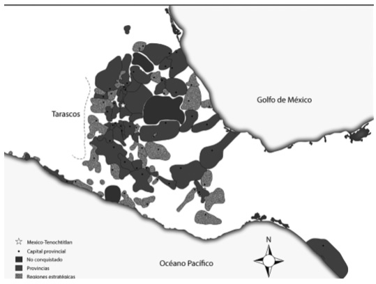 Los mexicas se liberaron del control político y administrativo de Azcapotzalco en 1428, dando paso a un rápido crecimiento económico y a la conformación de un imperio [Hassig 1988; Smith et al. 2001]. Los imperios son organizaciones caracterizadas por Barfield [2001: 13] como estados establecidos por medio de la Conquista, con soberanía sobre territorios continentales o subcontinentales y bajo un sistema administrativo unificado y centralizado en el que se incorporan millones de personas a. La administración es sustentada mediante un sistema de tributos o con base en la aplicación de impuestos directos, reforzados por una fuerza militar permanente encargada de cumplir con la ley y el orden internos y la defensa de amenazas externas. La organización política mexica cumple con todos estos preceptos poco después de su independencia, lo que permitió dar paso a un modelo agresivo de expansión. El imperio mexica ha sido categorizado de corte hegemónico [Hassig 1988; Smith 1996] en donde el control físico de los territorios es ejecutado de manera indirecta y se aplican bajos niveles de inversión en materia de infraestructura provincial. Sin embargo, cada caso era distinto, por lo que la administración imperial debía mantenerse flexible y abierta a la negociación. La imposición de una nueva administración a las provincias3 representaba más gasto y una mayor necesidad de fuerza para implementar la nueva organización. Sin embargo, en aquellas regiones donde se negociaba una suave transición hacia el nuevo orden mexica se experimentaba una menor extracción de recursos y una mayor disposición hacia la diplomacia.