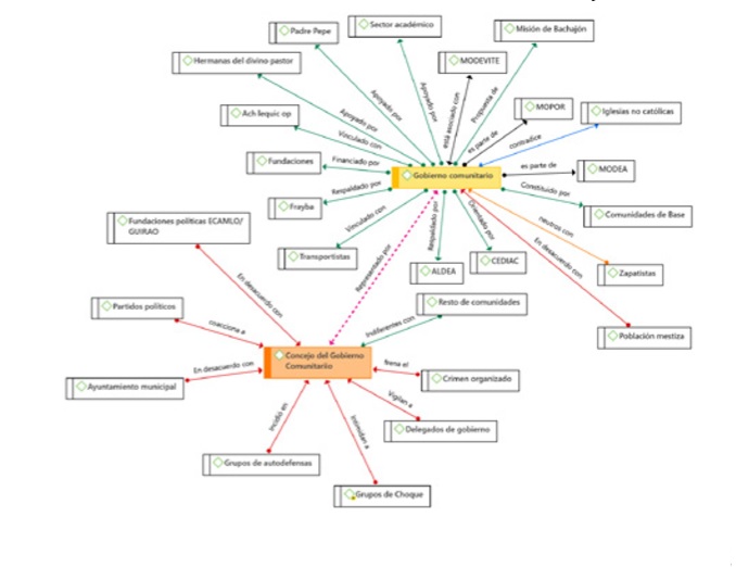 En la figura 1 se observa la relación de apoyo que existe en torno al proyecto de Gobierno Comunitario por parte de la Iglesia católica y el sector académico, así como los vínculos con otros grupos y movimientos sociales, el respaldo de los Centros de Derecho Humanos, entre otros. Sin embargo, cuando se exhibe al Concejo del Gobierno Comunitario como los principales representantes de la propuesta, es posible apreciar a los actores que están en desacuerdo, que vigilan y frenan sus acciones.