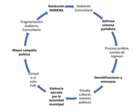 La propuesta de suprimir el esquema partidista amenaza con romper el control social que los grupos de poder local mantienen con la estructura del gobierno municipal, así que se genera un tipo de relación conflictual: cismogénesis complementaria con lucha por el poder, la cual genera violencia.