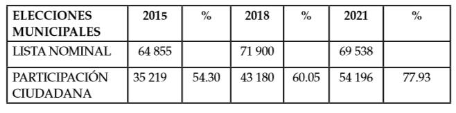 Como se muestra en el cuadro 1, comparando las últimas tres elecciones municipales, es notorio el incremento de la actividad política de los partidos y el porcentaje de sufragistas que acudieron a las urnas.