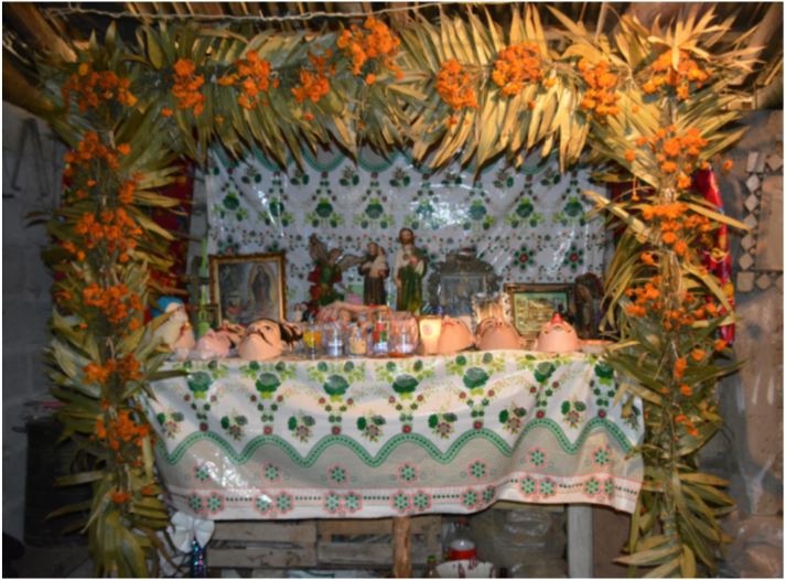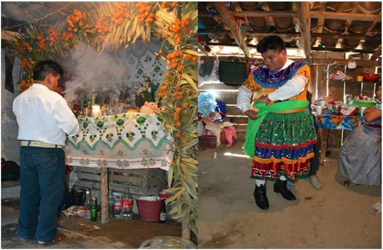 Como parte de la preparación de los danzantes, para algunas danzas se elaboran altares en la casa del caporal o del personaje principal de la danza. El altar se dispone en una mesa con diferentes ofrendas como pulque, aguardiente, velas, incensario, maíz, fruta, pan, tamales y, en general, comida realizada con los animales sacrificados previamente. En este altar se colocan los diversos accesorios de la danza como máscaras, instrumentos musicales, bastones de mando o cualquier otro elemento de la indumentaria. Tal acto sacraliza y protege a los objetos ahí dispuestos, les dota, desde la perspectiva del pensamiento mesoamericano, de agencia, pues todos estos elementos permiten estar en contacto con las entidades del tiempoespacio divino. De alguna manera, formarán parte del danzante durante el acto ( figura 2).