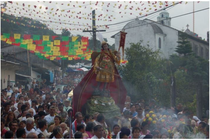 Los actos rituales en la tradición mesoamericana incluyen ceremonias y ofrendas donde existe una participación colectiva de música, canto, danza y oración. También se realizan plegarias, representación de episodios míticos o paisajes rituales, como contextos para la interacción con lo divino, la búsqueda de la estabilización del cosmos a partir de crear puentes o portales entre el ecúmeno y el anecúmeno. Estas manifestaciones relacionan tiempo, espacio y movimiento, representan ciclos, se ponen en contacto los opuestos complementarios, por ejemplo, vida-muerte, y alimentan el flujo de fuerzas entre el ecúmeno y el anecúmeno. Relevantes, en este sentido, son las fiestas patronales, compuestas por una gran diversidad de actos rituales que abren y cierran portales permitiendo que el santo patrono conviva con el pueblo y se alimente de su trabajo en una lógica de reciprocidad ( figura 3).