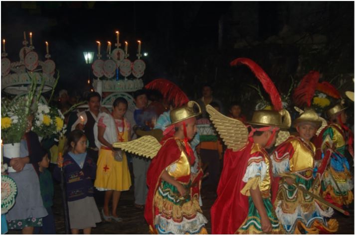 En las fiestas patronales mexicanas, las danzas siempre trabajan (téquitl) para acompañar al santo en los recorridos hacia la casa de los mayordomos, hacia la iglesia, algún cerro o cueva, etcétera. Un ejemplo, es la Danza Cotlatlaztin del pueblo nahua de Zitlala, Guerrero; a partir de la media noche se inicia un recorrido, primero hay una presentación en la iglesia, ahí dejan sus velas y flores ante la cruz del atrio. Este ritual se denomina teopancalaquilistle o “entrar a la morada de los dioses” [ Díaz 2003]. Las procesiones, en algunas ocasiones, pueden hacerse durante toda la noche, como una forma de velar, donde los danzantes intercambian energía entre los dos tiempo-espacios o alimentar a los dioses, pues ellos también trabajan durante la fiesta y las ceremonias en el tiempo-espacio de los humanos ( figura 4).