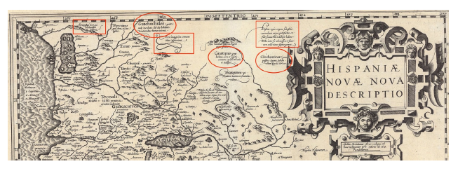Blaeu, al igual que sus antecesores, se limita a decir que el interior es todavía desconocido y sólo se conocen las costas [ Blaeu 1665]. Por su parte, Paolo Santini en la Carte du Mexique et de la Nouvelle Espagne Contenant Le Partie Australe de L’Amerique Septentle de 1779 muestra información acerca de lo que denomina chichimecos entre Zacatecas y Fresnillo, igualmente hace referencia a un grupo denominado Guaxutxites (¿Guachchiles?), al este de Parras y al sur de Nuevo León, también se hace mención del territorio “desconocido a detalle”, es decir, la región que comprende los actuales estados de Coahuila y Nuevo León ( figura 7).
