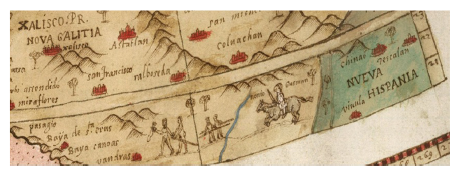 Para los fines de este estudio llama la atención la representación de Nuño de Guzmán, quien aparece montando a caballo sobre un camino ( figura 4) y parte del este de México con dirección al occidente; esta representación puede ser la referencia a su incursión de 1529 y más adelante se convertiría en la provincia de la Nueva Galicia [ García Icazbalceta 1999]. La representación de un gran río puede deberse al de Pánuco en Veracruz, provincia donde fue gobernador. Es de extrañar la ausencia de la Laguna de Chapala, a pesar que en los planos de Ortelius sí se identifica; ésa fue la primera de muchas expediciones que otros seguirían al territorio nómada y donde iniciaría el proceso de conquista y colonización a “sangre y fuego”. Es necesario recordar cuando Beltrán Nuño de Guzmán comisionó a Gonzalo López en 1530 para cruzar la Sierra Madre Occidental desde Culiacán. Si bien no es posible determinar con certeza hasta dónde llegó su empresa, sus comentarios son muy interesantes. López describió dichas llanuras como desiertos despoblados, donde no había sino indios “salvajes” sin caminos ni poblados; la expedición fue tan cruenta que refirió, de no haber sido por un poco de maíz que había dejado enterrado, todos hubieran muerto [ García Icazbalceta 2004].