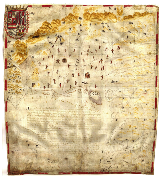 Se puede comprender la intención de representar a Nuño de Guzmán en el mapamundi de Urbano Monte como la finalidad de justificar las incursiones de los conquistadores españoles a un territorio donde, ya desde ese momento, se perfilaba como potencial abastecedor de las riquezas tan anheladas en el imaginario español. La realidad, como sabemos, sólo se concentró en los primeros reales de minas localizados en Zacatecas, Sombrerete/Llerena, San Martín, Indeé, entre muchos otros, como muy acertado ha señalado Thomas Hillerkuss. Sólo en muy pocas representaciones cartográficas de inicios del siglo xvi aparecen sus ubicaciones, ocultándolas después por varias décadas en los mapas subsiguientes [ Hillerkuss 2013]. Las necesidades de la Corona española se concentraron entonces en difuminar o hacer poco visible una vasta región donde los nómadas y seminómadas se convirtieron en moneda de cambio, donde las rebeliones fueron las más duras manifestaciones de su defensa contra la esclavitud y el despojo.