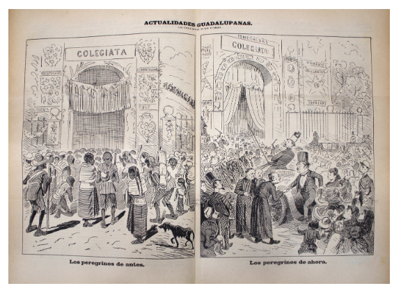 Mediante el contraste de materiales artesanales y piedras preciosas, así como de peregrinos descalzos y en carrozas, la caricatura refirió a la modernización del Santuario del Tepeyac en el siglo xix. En específico, la imagen criticó la remodelación de la Colegiata dirigida por el presbítero Antonio Plancarte para celebrar la coronación de la Virgen de Guadalupe. De acuerdo con la composición, la opulencia de la restauración financiada por la aristocracia porfiriana, como el hombre bienvenido por los curas, implicó la exclusión de los indígenas entre los “peregrinos de ahora”.