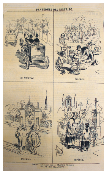 La caricatura “Panteones del Distrito” representó las mencionadas mejoras materiales. El Tepeyac aparece en comparación con el cementerio francés y el español, ya que todos abundan en arboledas, bellas sepulturas, refinados visitantes, incluso curas. En oposición, la imagen muestra el panteón de Dolores con tumbas rústicas y personas de condición humilde ( foto 2). El contraste entre necrópolis denunció el desplazamiento de la población de menores recursos de los camposantos locales, considerando que el lote perpetuo estableció montos muy elevados: $350 por adultos, $250 para párvulos y $1 780 un lugar para una cripta [ ahcm 1893: 6 ].
