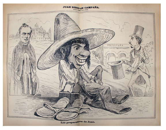 La complicidad entre el Ayuntamiento de Guadalupe Hidalgo y la empresa de transformar el Tepeyac en un centro de peregrinación de talla internacional quedó registrada en el seguimiento de las mejoras materiales de la municipalidad. En la caricatura “Juan Diego en campaña” vemos al presidente municipal pedir limosna con un sombrero de copa a Antonio Plancarte situado frente a la Colegiata ( foto 3). El gesto del prefecto remite a que durante los años previos a la coronación se realizaron trabajos de urbanización en Guadalupe Hidalgo, pero a falta de fondos la municipalidad pidió préstamos como lo hiciera Plancarte.